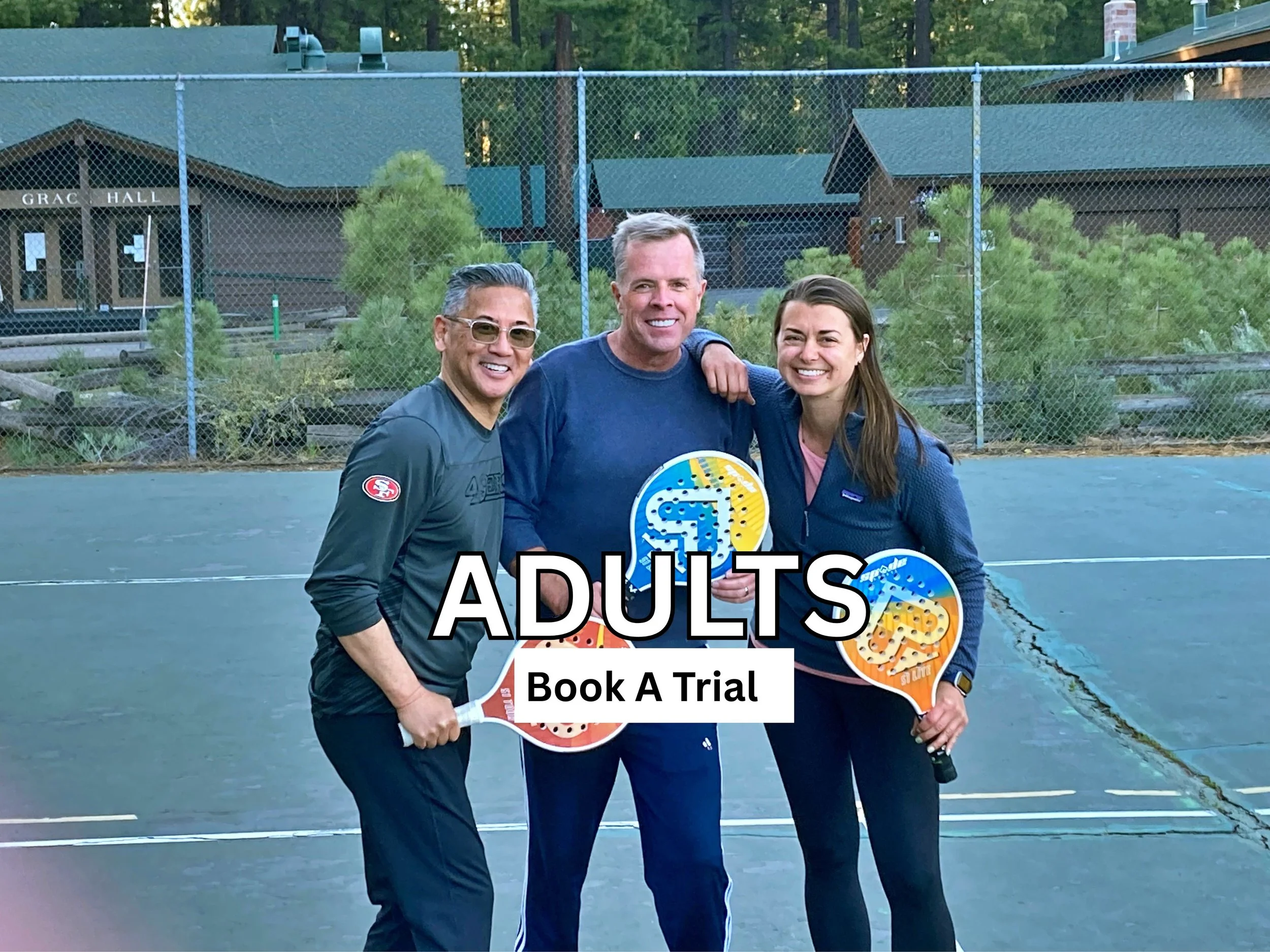 We provide equipment, so there’s nothing holding you back from coming out to try a class. Yes, we use modified racquets because they help our players learn faster and have more fun (and no, this is not pickleball).